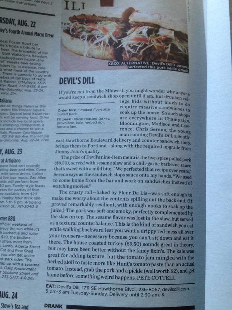 Devil's Dill Sandwich Shop on SE Hawthorne Blvd in Portland, OR, is a sandwich lover's paradise. Offering a variety of mouthwatering sandwiches, vegan options, and even German potato salad, this casual spot is perfect for dinner or late-night cravings. With superb customer service and quick service, Devil's Dill ensures a satisfying dining experience. Customers rave about the delicious sandwiches, variety of options, and the friendly staff. While seating is limited, the focus here is on the fantastic sandwiches, not lingering at the table. Whether you're grabbing a quick bite to go or enjoying a meal with friends, Devil's Dill Sandwich Shop is a must-visit for sandwich enthusiasts in Portland.